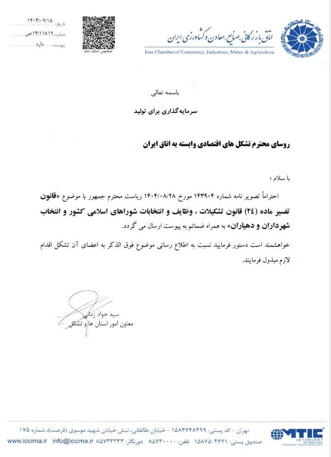 انتشار نسخه فارسی مدل EFQM 2025 به بنگاه های اقتصادیآذر ۱۲, ۱۴۰۴طرح واردات کائو چو از غرب آفریقا در قبال صادرات میلگرد نیجریهآذر ۱۶, ۱۴۰۴ابلاغ قانون تفسیر ماده 24 قانون تشکیلات ، وظایف و انتخابات شوراهای اسلامی کشور و انتخاب شهرداران و دهیاران آذر ۱۶, ۱۴۰۴ کلیک کنیداشتراکمطالب مرتبطدی ۷, ۱۴۰۴تقویم نمایشگاهی کشور برزیل در سال 2026 (1404-1405)اطلاعات بیشتردی ۷, ۱۴۰۴دوره آموزشی مجازی «تربیت ممیزان داخلی مدیریت کربن براساس 14064 ISO و 14067 ISO »اطلاعات بیشتردی ۷, ۱۴۰۴مزایده درخصوص پرونده کثیرالشاکی موسوم به خودروسازی آذویکواطلاعات بیشتر