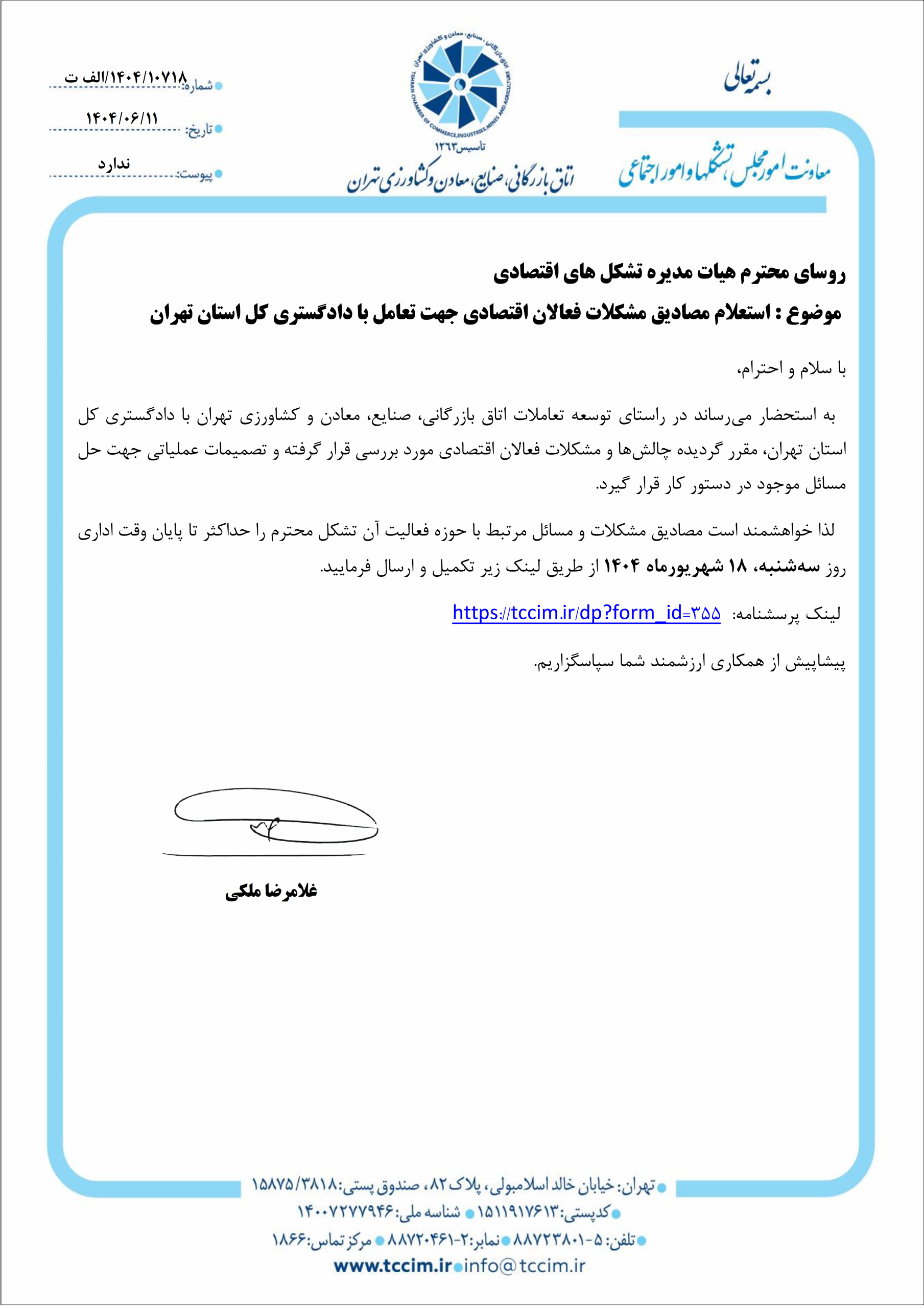 مکاتبه رئیسکل محترم سازمان توسعه تجارت ایران با موضوع تمدید فراخوان مشوقهای صادراتی سال ۱۴۰۳شهریور ۱۷, ۱۴۰۴نشست اقتصاد دریا محور، صنایع پیشران دریای – مورخ 18 شهریورشهریور ۱۷, ۱۴۰۴استعلام مصادیق مشکلات فعالان اقتصادی جهت تعامل با دادگستری کل استان تهران شهریور ۱۷, ۱۴۰۴ اشتراکمطالب مرتبطمهر ۱۶, ۱۴۰۴تغییر تاریخ اعزام هیات تجاری به نمایشگاه بین المللی یونیورسالی تاجیکستان-دوشنبه از مهر به ابان 1404اطلاعات بیشترمهر ۱۶, ۱۴۰۴سلسله سخنرانی های علمی با موضوع ساعتی به کیفیت بیاندیشیم – مورخ 27 مهر لغایت 13 آبان ماه 1404اطلاعات بیشترمهر ۱۵, ۱۴۰۴سمپوزیوم راهبری هوشمندانه در دنیای متلاطم؛ اقتصاد و استراتژی برای مدیران آینده نگر در تاریخ 23 و 24 مهر ماه 1404اطلاعات بیشتر
