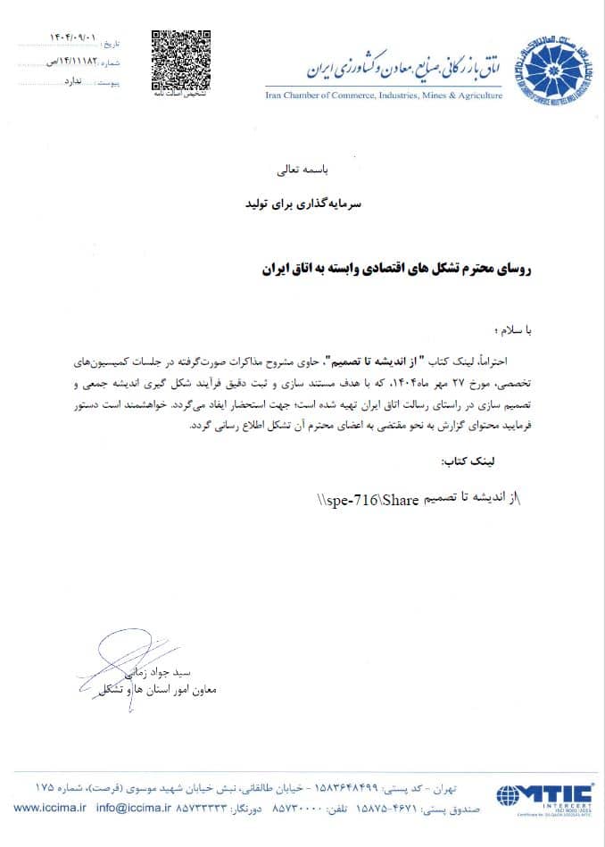 هشتمین دوره نمایشگاه فارمکس- مورخ 16 لغایت 18 اردیبهشت 1405آذر ۲, ۱۴۰۴انتشار کتاب از اندیشه تا تصمیم در راستای رسالت اتاق بازرگانی ایران آذر ۲, ۱۴۰۴ اشتراکمطالب مرتبطآذر ۲, ۱۴۰۴هشتمین دوره نمایشگاه فارمکس- مورخ 16 لغایت 18 اردیبهشت 1405اطلاعات بیشترآذر ۲, ۱۴۰۴اطلاع رسانی اعزام هیات تجاری به قزاقستان در آذر ماه 1404اطلاعات بیشترآذر ۲, ۱۴۰۴هشتمین دوره اموزشی مدیریت کربن ، انرژی و آب – مورخ 19 آذر ماه 1404اطلاعات بیشتر
