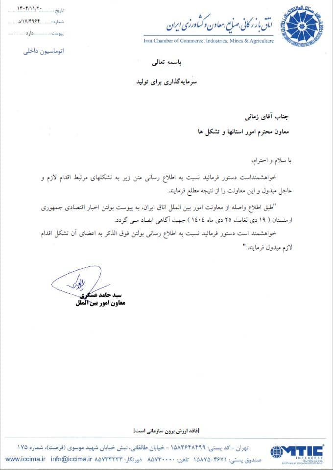 تصویبنامه هیات وزیران درخصوص اصلاح تصویبنامه شماره 24161ت 54293 ه مورخ 2 خرداد 1396بهمن ۲۹, ۱۴۰۴عطف جدول نمایشگاه های بین المللی بولیوی 2026بهمن ۲۹, ۱۴۰۴بولتن اخبار و رویدادهای اقتصادی جمهوری ارمنستان بهمن ۲۹, ۱۴۰۴ کلیک کنیداشتراکمطالب مرتبطبهمن ۲۹, ۱۴۰۴عطف جدول نمایشگاه های بین المللی بولیوی 2026اطلاعات بیشتربهمن ۲۹, ۱۴۰۴تصویبنامه هیات وزیران درخصوص اصلاح تصویبنامه شماره 24161ت 54293 ه مورخ 2 خرداد 1396اطلاعات بیشتربهمن ۲۹, ۱۴۰۴معافیت برخی محصولات کشاورزی و دام از مالیات و عوارض گمرکی در تاجیکستاناطلاعات بیشتر