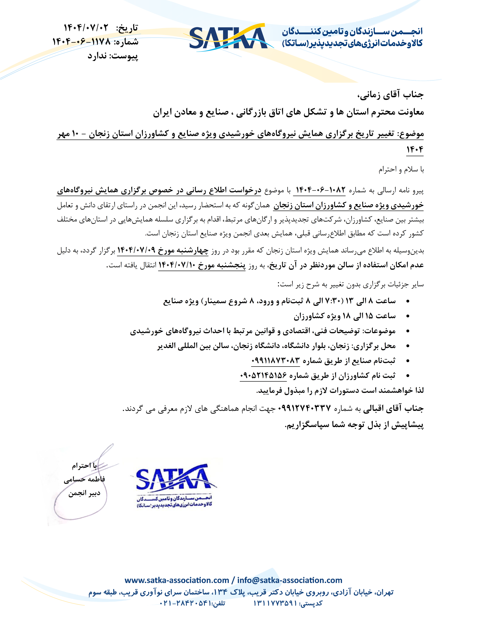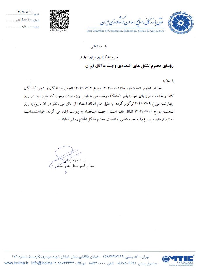 دعوت به جلسه روز ملی کیفیت 18 آبان ماه 1404مهر ۸, ۱۴۰۴چهارمین نشست راهبردی ایران و اوراسیا در تاریخ 30 مهر ماه 1404مهر ۸, ۱۴۰۴تغییر تاریخ برگزاری همایش نیروگاههای خورشیدی ویژه صنایع و کشاورزان استان زنجان – مورخ 10 مهر 1404 مهر ۸, ۱۴۰۴ اشتراکمطالب مرتبطمهر ۱۶, ۱۴۰۴تغییر تاریخ اعزام هیات تجاری به نمایشگاه بین المللی یونیورسالی تاجیکستان-دوشنبه از مهر به ابان 1404اطلاعات بیشترمهر ۱۶, ۱۴۰۴سلسله سخنرانی های علمی با موضوع ساعتی به کیفیت بیاندیشیم – مورخ 27 مهر لغایت 13 آبان ماه 1404اطلاعات بیشترمهر ۱۵, ۱۴۰۴سمپوزیوم راهبری هوشمندانه در دنیای متلاطم؛ اقتصاد و استراتژی برای مدیران آینده نگر در تاریخ 23 و 24 مهر ماه 1404اطلاعات بیشتر