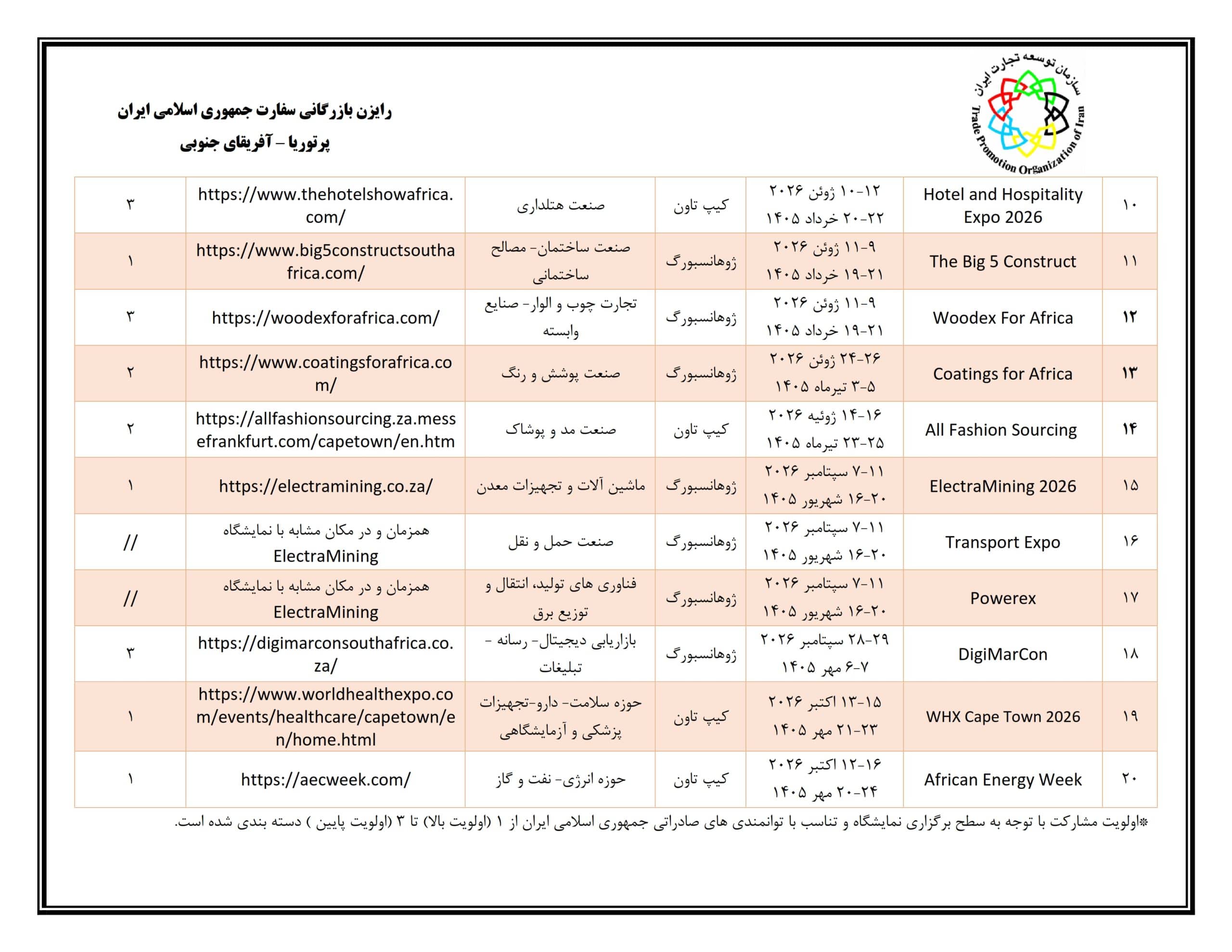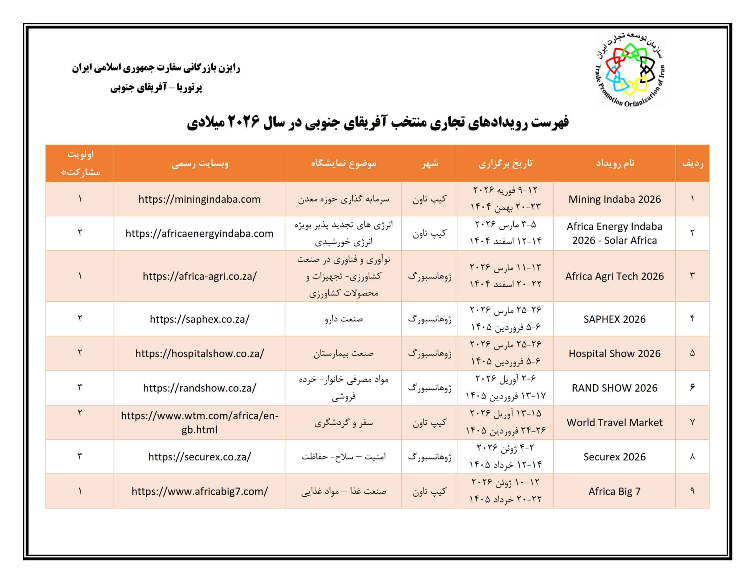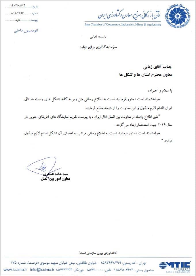 برگزاری کنفرانس و نمایشگاه جهانی هیدروژن 2025 در کره جنوبی – مورخ 13 لغایت 16 آذر ماهآذر ۱, ۱۴۰۴نمایشگاه اکسپو بنگلادش- داکا مورخ 10لغایت 12 آذر ماه 1404آذر ۲, ۱۴۰۴تقویم نمایشگاهی آفریقای جنوبی در سال 2026 آذر ۲, ۱۴۰۴ اشتراکمطالب مرتبطآذر ۲, ۱۴۰۴انتشار کتاب از اندیشه تا تصمیم در راستای رسالت اتاق بازرگانی ایراناطلاعات بیشترآذر ۲, ۱۴۰۴هشتمین دوره نمایشگاه فارمکس- مورخ 16 لغایت 18 اردیبهشت 1405اطلاعات بیشترآذر ۲, ۱۴۰۴اطلاع رسانی اعزام هیات تجاری به قزاقستان در آذر ماه 1404اطلاعات بیشتر