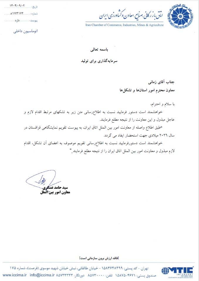 فهرست مهمترین مناقصات قزاقستانآذر ۱۰, ۱۴۰۴اعزام هیات تجاری به قزاقستان در حوزه های کاری اعلام شدهآذر ۱۰, ۱۴۰۴تقویم نمایشگاهی قزاقستان در سال 2026 میلادی آذر ۱۰, ۱۴۰۴ کلیک کنیداشتراکمطالب مرتبطآذر ۱۰, ۱۴۰۴اعزام هیات تجاری به قزاقستان در حوزه های کاری اعلام شدهاطلاعات بیشترآذر ۱۰, ۱۴۰۴فهرست مهمترین مناقصات قزاقستاناطلاعات بیشترآذر ۱۰, ۱۴۰۴وبینار تخصصی با عنوان از ایده تا صادرات با مشارکت در پلتفرم جهانی جیتکساطلاعات بیشتر