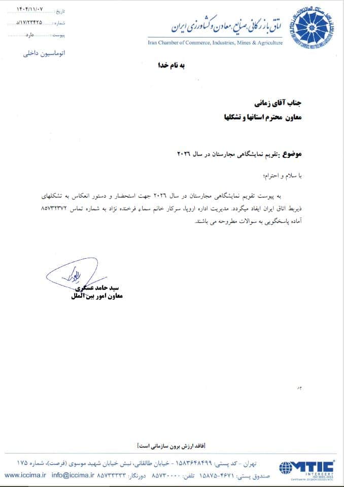 تقویم نمایشگاهی کشور برزیل در سال 2026 (1404-1405)دی ۷, ۱۴۰۴به استناد تقویم نمایشگاهی قزاقستان در سال 2026 میلادیبهمن ۱۱, ۱۴۰۴تقویم نمایشگاهی مجارستان در سال 2026 بهمن ۱۱, ۱۴۰۴ کلیک کنیداشتراکمطالب مرتبطبهمن ۱۱, ۱۴۰۴به استناد تقویم نمایشگاهی قزاقستان در سال 2026 میلادیاطلاعات بیشتردی ۷, ۱۴۰۴تقویم نمایشگاهی کشور برزیل در سال 2026 (1404-1405)اطلاعات بیشتردی ۷, ۱۴۰۴دوره آموزشی مجازی «تربیت ممیزان داخلی مدیریت کربن براساس 14064 ISO و 14067 ISO »اطلاعات بیشتر