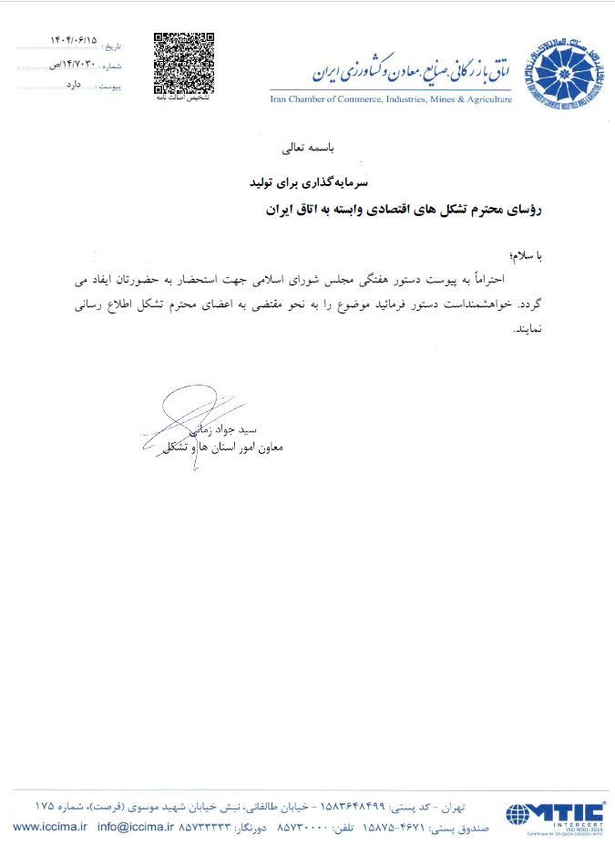 معرفی سامانه بازدید مجازی از نمایشگاههای بینالمللی جهت استفاده اعضا اتاق بازرگانیشهریور ۱۸, ۱۴۰۴گزارش جلسه علنی مجلس شورای اسلامی مورخ 1404/06/12شهریور ۱۸, ۱۴۰۴دستور هفتگی مجلس شورای اسلامی شهریور ۱۸, ۱۴۰۴ جهت دانلود پیوست کلیک کنیداشتراکمطالب مرتبطمهر ۱۶, ۱۴۰۴تغییر تاریخ اعزام هیات تجاری به نمایشگاه بین المللی یونیورسالی تاجیکستان-دوشنبه از مهر به ابان 1404اطلاعات بیشترمهر ۱۶, ۱۴۰۴سلسله سخنرانی های علمی با موضوع ساعتی به کیفیت بیاندیشیم – مورخ 27 مهر لغایت 13 آبان ماه 1404اطلاعات بیشترمهر ۱۵, ۱۴۰۴سمپوزیوم راهبری هوشمندانه در دنیای متلاطم؛ اقتصاد و استراتژی برای مدیران آینده نگر در تاریخ 23 و 24 مهر ماه 1404اطلاعات بیشتر