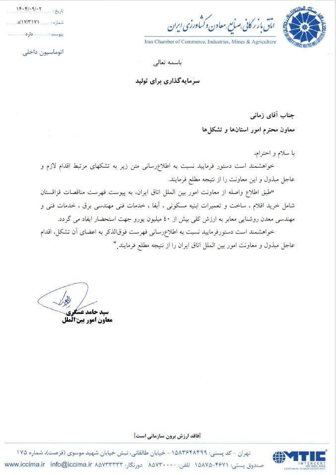 وبینار تخصصی با عنوان از ایده تا صادرات با مشارکت در پلتفرم جهانی جیتکسآذر ۱۰, ۱۴۰۴تقویم نمایشگاهی قزاقستان در سال 2026 میلادیآذر ۱۰, ۱۴۰۴فهرست مهمترین مناقصات قزاقستان آذر ۱۰, ۱۴۰۴ کلیک کنیداشتراکمطالب مرتبطآذر ۱۰, ۱۴۰۴اعزام هیات تجاری به قزاقستان در حوزه های کاری اعلام شدهاطلاعات بیشترآذر ۱۰, ۱۴۰۴تقویم نمایشگاهی قزاقستان در سال 2026 میلادیاطلاعات بیشترآذر ۱۰, ۱۴۰۴وبینار تخصصی با عنوان از ایده تا صادرات با مشارکت در پلتفرم جهانی جیتکساطلاعات بیشتر