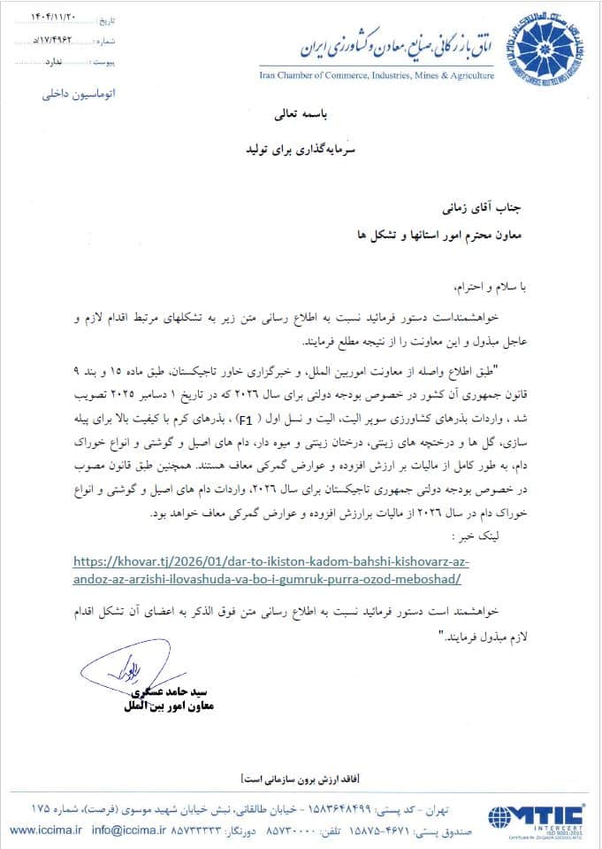 تغییر زمان برگزاری سومین همایش اینداست سولار ایران انجمن ساتکا – از 28 و 29 بهمن به 16 اسفندماه 1404بهمن ۲۹, ۱۴۰۴تصویبنامه هیات وزیران درخصوص اصلاح تصویبنامه شماره 24161ت 54293 ه مورخ 2 خرداد 1396بهمن ۲۹, ۱۴۰۴معافیت برخی محصولات کشاورزی و دام از مالیات و عوارض گمرکی در تاجیکستان بهمن ۲۹, ۱۴۰۴ اشتراکمطالب مرتبطبهمن ۲۹, ۱۴۰۴عطف جدول نمایشگاه های بین المللی بولیوی 2026اطلاعات بیشتربهمن ۲۹, ۱۴۰۴بولتن اخبار و رویدادهای اقتصادی جمهوری ارمنستاناطلاعات بیشتربهمن ۲۹, ۱۴۰۴تصویبنامه هیات وزیران درخصوص اصلاح تصویبنامه شماره 24161ت 54293 ه مورخ 2 خرداد 1396اطلاعات بیشتر