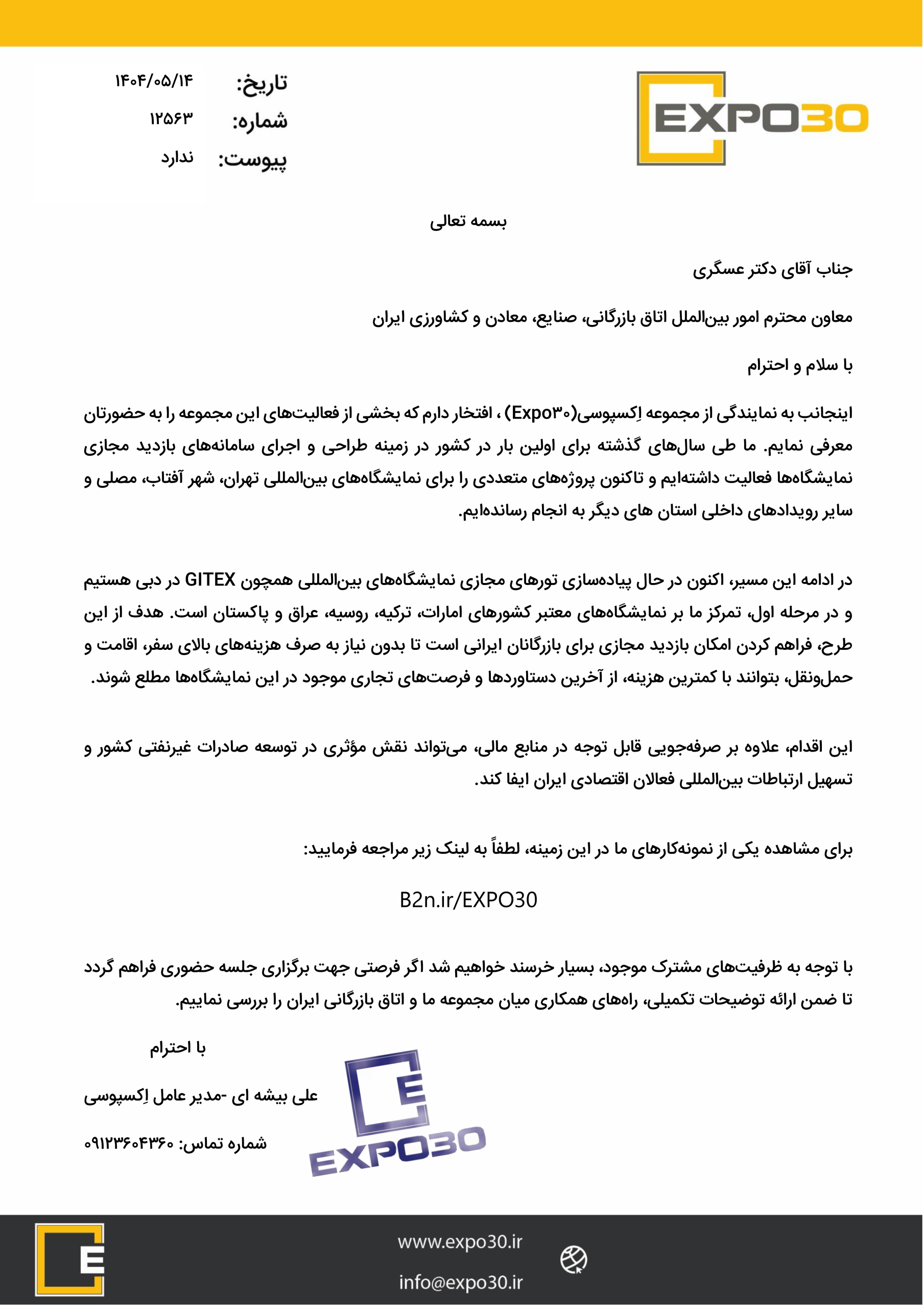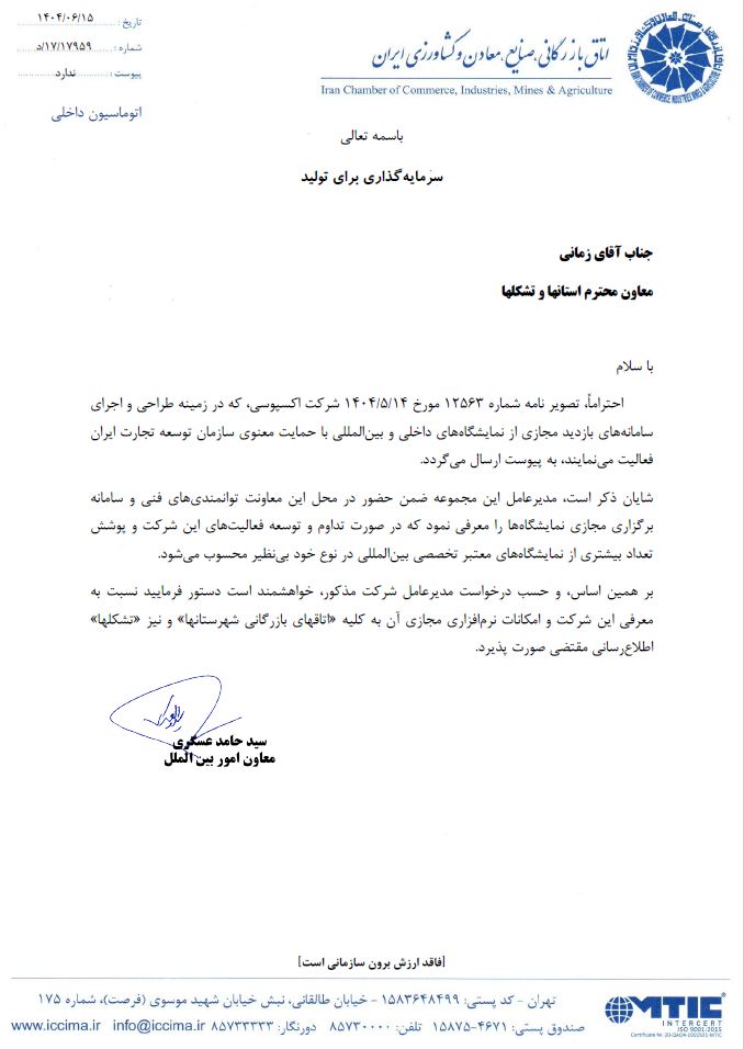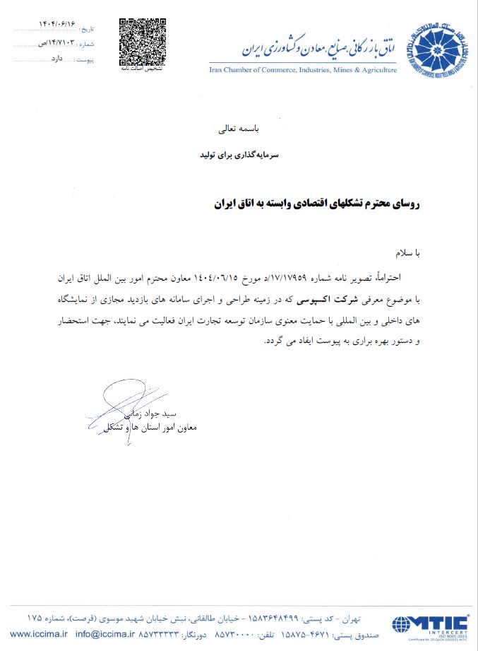 نشست اقتصاد دریا محور، صنایع پیشران دریای – مورخ 18 شهریورشهریور ۱۷, ۱۴۰۴دستور هفتگی مجلس شورای اسلامیشهریور ۱۸, ۱۴۰۴معرفی سامانه بازدید مجازی از نمایشگاههای بینالمللی جهت استفاده اعضا اتاق بازرگانی شهریور ۱۸, ۱۴۰۴ اشتراکمطالب مرتبطمهر ۱۶, ۱۴۰۴تغییر تاریخ اعزام هیات تجاری به نمایشگاه بین المللی یونیورسالی تاجیکستان-دوشنبه از مهر به ابان 1404اطلاعات بیشترمهر ۱۶, ۱۴۰۴سلسله سخنرانی های علمی با موضوع ساعتی به کیفیت بیاندیشیم – مورخ 27 مهر لغایت 13 آبان ماه 1404اطلاعات بیشترمهر ۱۵, ۱۴۰۴سمپوزیوم راهبری هوشمندانه در دنیای متلاطم؛ اقتصاد و استراتژی برای مدیران آینده نگر در تاریخ 23 و 24 مهر ماه 1404اطلاعات بیشتر