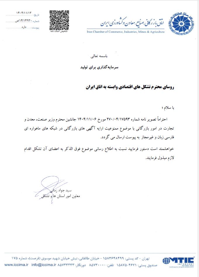 دوره تخصصی امنیت سایبری،امنیت اطلاعات و هوشمندسازی (وزارت کشور و موسسه ایده بنیان رایان)بهمن ۱۱, ۱۴۰۴تقویم کامل نمایشگاههای بینالمللی اکوادور در سال 2026بهمن ۱۳, ۱۴۰۴ممنوعیت ارائه آگهیهای بازرگانی در شبکههای ماهوارهای فارسی زبان و غیر مجاز بهمن ۱۳, ۱۴۰۴ اشتراکمطالب مرتبطبهمن ۱۳, ۱۴۰۴تقویم نمایشگاهی فرانسه در سال 2026اطلاعات بیشتربهمن ۱۳, ۱۴۰۴نخستین دوره نظام اعتبار بخشی مدیریت آب در 28 بهمن ماه از ساعت 8 الی 12 در اتاق بازرگانی تهراناطلاعات بیشتربهمن ۱۳, ۱۴۰۴گزارشات جلسات علنی مجلس طی دو هفته اخیراطلاعات بیشتر