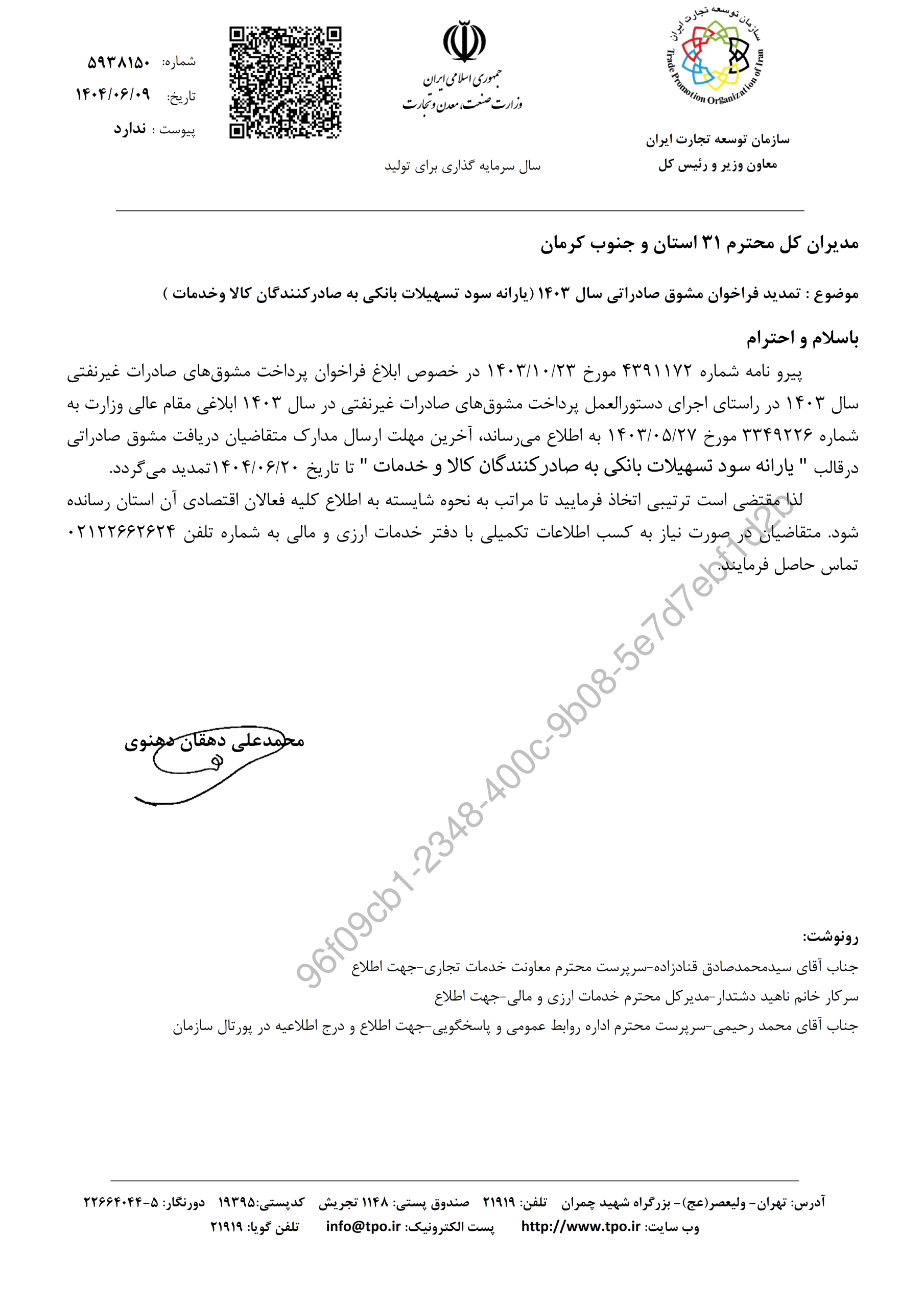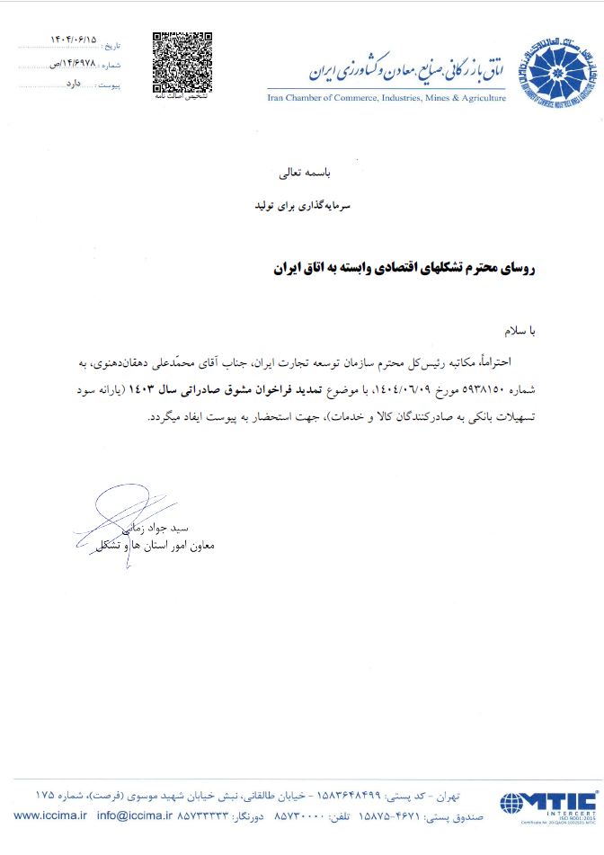 اطلاع رسانی اعزام هیئت نمایشگاه ژاپن مورخ 17 شهریور سال جاریشهریور ۵, ۱۴۰۴استعلام مصادیق مشکلات فعالان اقتصادی جهت تعامل با دادگستری کل استان تهرانشهریور ۱۷, ۱۴۰۴مکاتبه رئیسکل محترم سازمان توسعه تجارت ایران با موضوع تمدید فراخوان مشوقهای صادراتی سال ۱۴۰۳ شهریور ۱۷, ۱۴۰۴ اشتراکمطالب مرتبطمهر ۱۶, ۱۴۰۴تغییر تاریخ اعزام هیات تجاری به نمایشگاه بین المللی یونیورسالی تاجیکستان-دوشنبه از مهر به ابان 1404اطلاعات بیشترمهر ۱۶, ۱۴۰۴سلسله سخنرانی های علمی با موضوع ساعتی به کیفیت بیاندیشیم – مورخ 27 مهر لغایت 13 آبان ماه 1404اطلاعات بیشترمهر ۱۵, ۱۴۰۴سمپوزیوم راهبری هوشمندانه در دنیای متلاطم؛ اقتصاد و استراتژی برای مدیران آینده نگر در تاریخ 23 و 24 مهر ماه 1404اطلاعات بیشتر