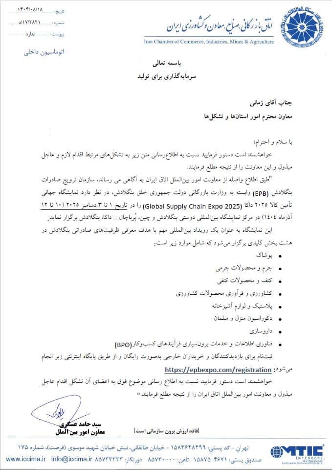 تقویم نمایشگاهی آفریقای جنوبی در سال 2026آذر ۲, ۱۴۰۴تقویم نمایشگاهی 2025 گرجستانآذر ۲, ۱۴۰۴نمایشگاه اکسپو بنگلادش- داکا مورخ 10لغایت 12 آذر ماه 1404 آذر ۲, ۱۴۰۴ اشتراکمطالب مرتبطآذر ۲, ۱۴۰۴انتشار کتاب از اندیشه تا تصمیم در راستای رسالت اتاق بازرگانی ایراناطلاعات بیشترآذر ۲, ۱۴۰۴هشتمین دوره نمایشگاه فارمکس- مورخ 16 لغایت 18 اردیبهشت 1405اطلاعات بیشترآذر ۲, ۱۴۰۴اطلاع رسانی اعزام هیات تجاری به قزاقستان در آذر ماه 1404اطلاعات بیشتر
