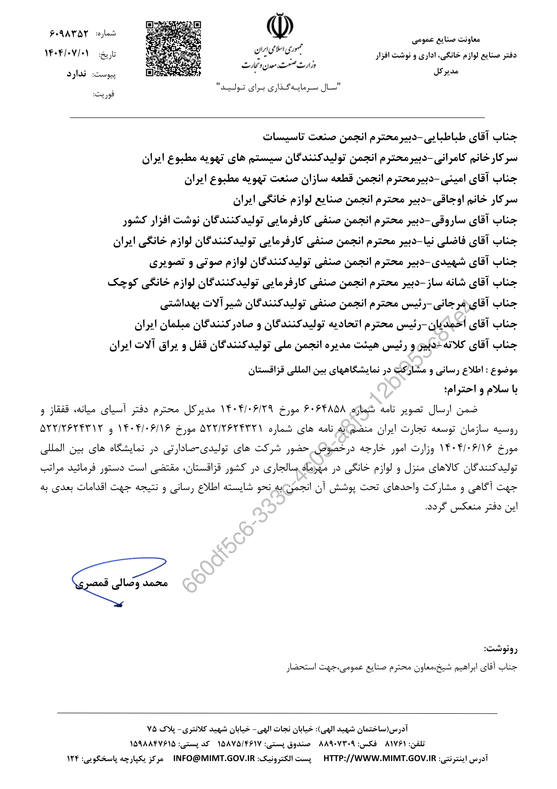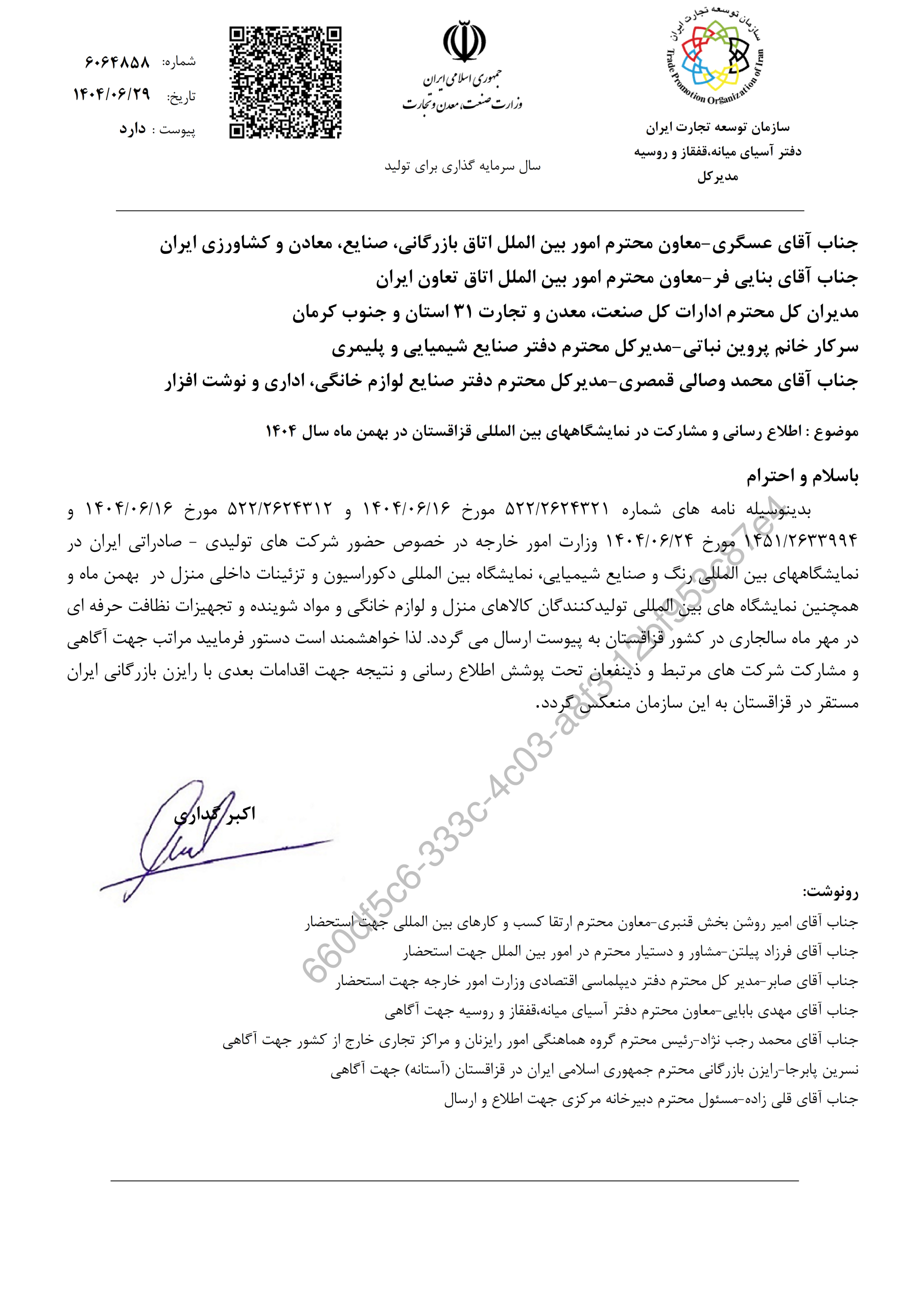 گزارش جلسه علنی مجلس شورای اسلامی مورخ 1404/06/12شهریور ۱۸, ۱۴۰۴دعوت به جلسه روز ملی کیفیت 18 آبان ماه 1404مهر ۸, ۱۴۰۴مشارکت در نمایشگاه های بین المللی قزاقستان مهر ۵, ۱۴۰۴ اشتراکمطالب مرتبطمهر ۱۶, ۱۴۰۴تغییر تاریخ اعزام هیات تجاری به نمایشگاه بین المللی یونیورسالی تاجیکستان-دوشنبه از مهر به ابان 1404اطلاعات بیشترمهر ۱۶, ۱۴۰۴سلسله سخنرانی های علمی با موضوع ساعتی به کیفیت بیاندیشیم – مورخ 27 مهر لغایت 13 آبان ماه 1404اطلاعات بیشترمهر ۱۵, ۱۴۰۴سمپوزیوم راهبری هوشمندانه در دنیای متلاطم؛ اقتصاد و استراتژی برای مدیران آینده نگر در تاریخ 23 و 24 مهر ماه 1404اطلاعات بیشتر