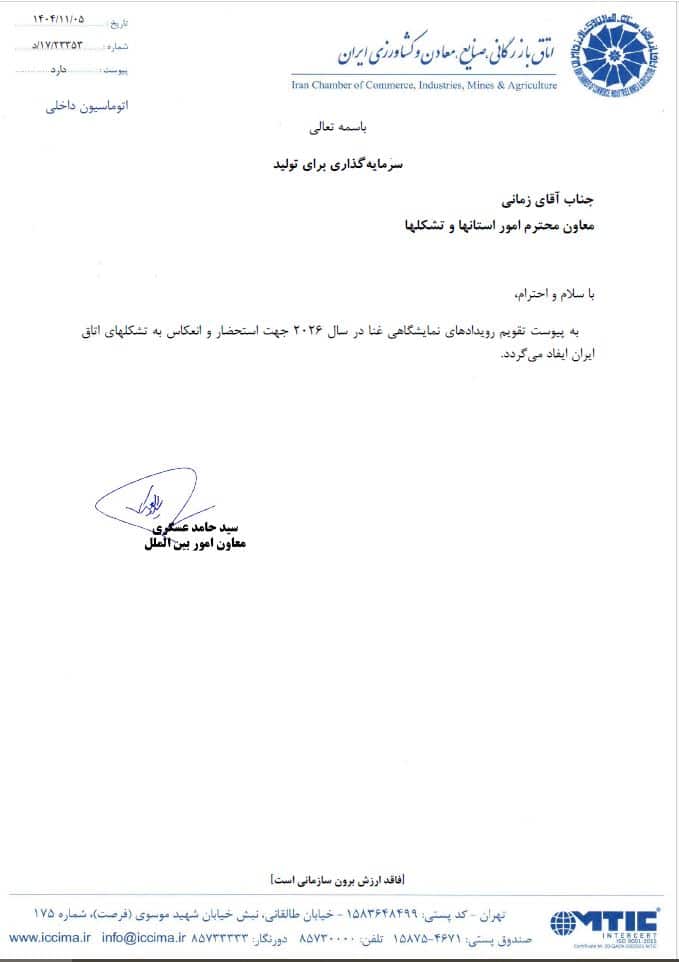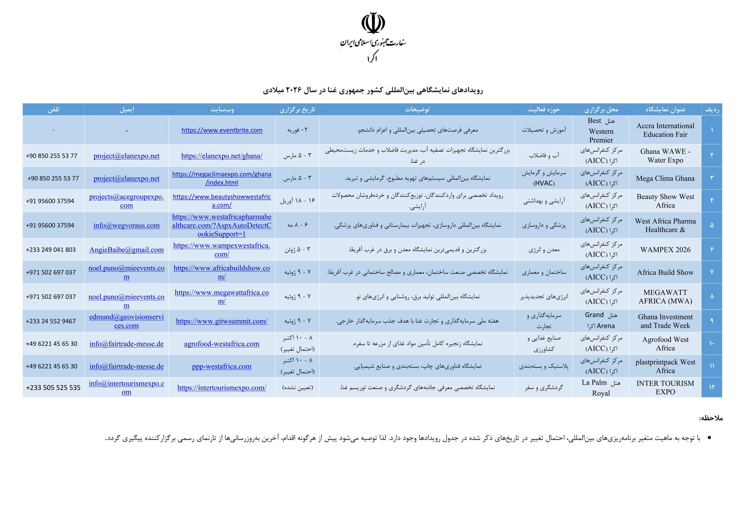تقویم نمایشگاهی قزاقستان در سال 2026 میلادیبهمن ۱۱, ۱۴۰۴تغییر زمان برگزاری سومین همایش اینداست سولار ایران انجمن ساتکا – از 8 و 9 بهمن به 28 و 29 بهمن 1404بهمن ۱۱, ۱۴۰۴تقویم رویدادهای نمایشگاهی غنا در سال 2026 بهمن ۱۱, ۱۴۰۴ اشتراکمطالب مرتبطبهمن ۱۱, ۱۴۰۴گزارش رشد اقتصادی رومانی و کشورهای اروپاییاطلاعات بیشتربهمن ۱۱, ۱۴۰۴همایش سرمایه گذاری صحار 2026 – 15 لغایت 16 بهمن ماهاطلاعات بیشتربهمن ۱۱, ۱۴۰۴تغییر زمان برگزاری سومین همایش اینداست سولار ایران انجمن ساتکا – از 8 و 9 بهمن به 28 و 29 بهمن 1404اطلاعات بیشتر